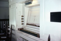 The Principal dulcis 8' has a stopped Quintadena bass and from tenor c, some of the pipes are in the facade. The Gedackt is stopped wood and the Flaute is open. The Mixtur is 2 ranks and has a single break at middle c. The Terzan is an unusual stop that was possibly meant to give a similar effect as adding a Trumpet. The rank begins at 1 3/5' and breaks to 3 1/5 at middle c. The effect of this stop is really quite splendid.