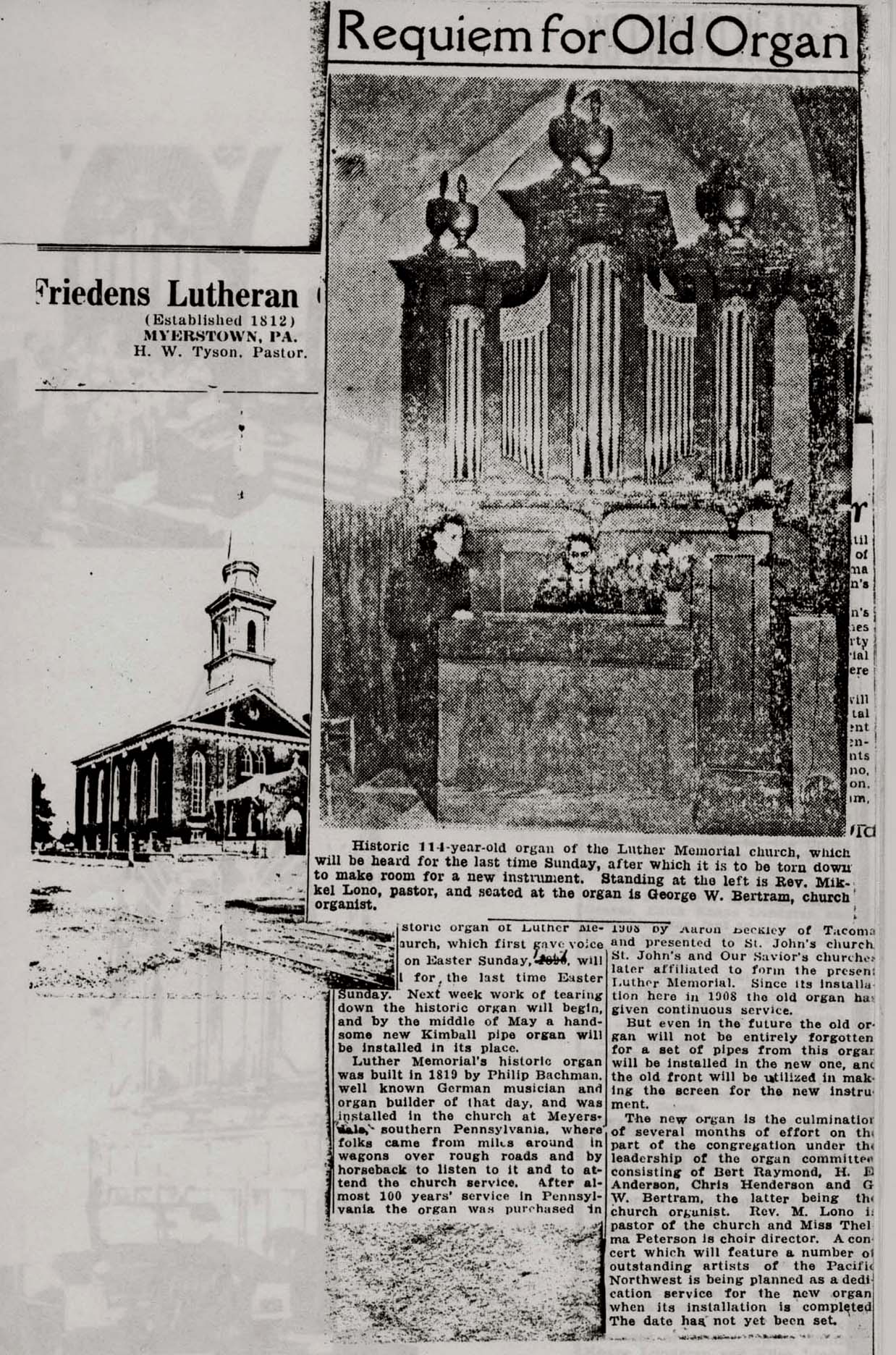 The organ in Friedens Lutheran Church in Myerstown, PA was built by Philip Bachmann in Lititz. It was used until 1908 when it was sold to Grace Evangelical Lutheran Church in Tacoma, Washington. The organ was used there until 1933 when it was replaced by an electro-pneumatic organ. The case and front pipes were used as part of the new organ, however, as were about 50 metal Principal pipes. The remainder of the organ was supposedly placed in storage in the State Museum in Tacoma. Those parts have since disappeared, however. The church, now Luther Memorial Church, has recently closed and the remaining parts of the Bachmann organ which include the front of the case, the metal pipes as well as the detached reversed console kept in the basement of the church will be stored at the shop of Paul Fritts.