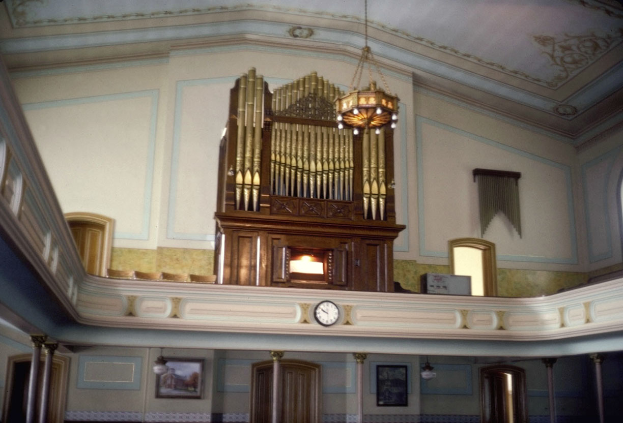 The George Krauss organ in Huff's Church was originally installed in their building from 1817. One history of the church gives the date 1852 while another the date 1865. In 1881, it was removed and then installed in the new building in 1883. Most likely this work was done by Edwin Krauss who was responsible for replacing the original front with the present Victorian front. The original front was stored in the attic of the church. While this newer front gives the appearance of a late Victorian organ, the internal construction is actually quite antiquated, even for 1865. The sound, in fact, is very similar to a Tannenberg organ.