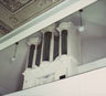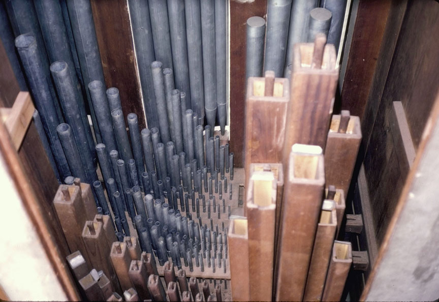 The Principal dulcis 8' has a stopped Quintadena bass and from tenor c, some of the pipes are in the facade. The Gedackt is stopped wood and the Flaute is open. The Mixtur is 2 ranks and has a single break at middle c. The Terzan is an unusual stop that was possibly meant to give a similar effect as adding a Trumpet. The rank begins at 1 3/5' and breaks to 3 1/5 at middle c. The effect of this stop is really quite splendid.