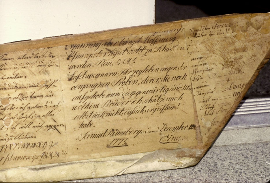 The Lutheran Church in Plainfield still has in their possession, a Gedackt pipe and one of the bellows ribs with writing (in German) and Samuel Tannenberg's signature and the date December 2, 1773. Samuel was seven years old in 1773.